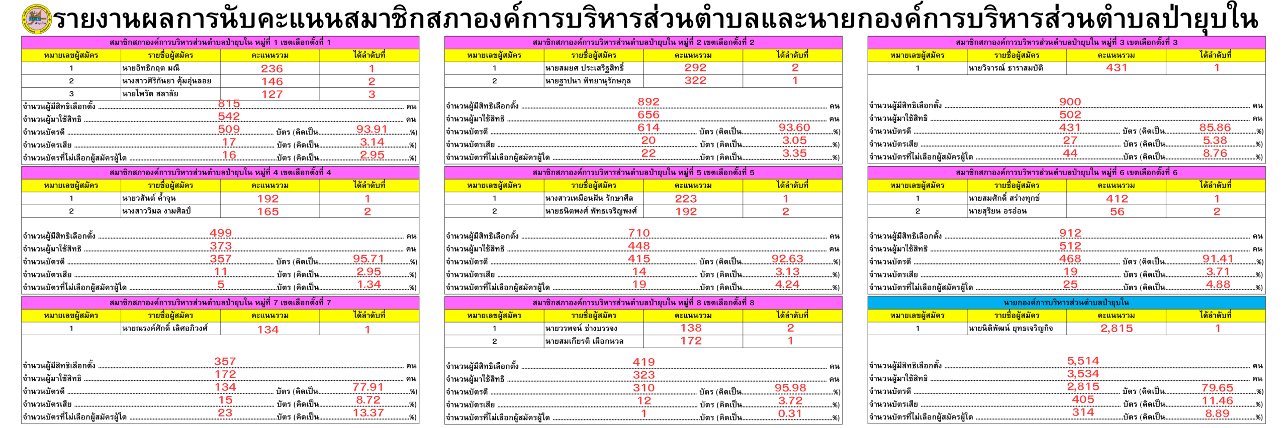รายงานผลการนับคะแนนสมาชิกสภาองค์การบริหารส่วนตำบลและนายกองค์การบริหารส่วนตำบลป่ายุบใน (อย่างไม่เป็นทางการ)