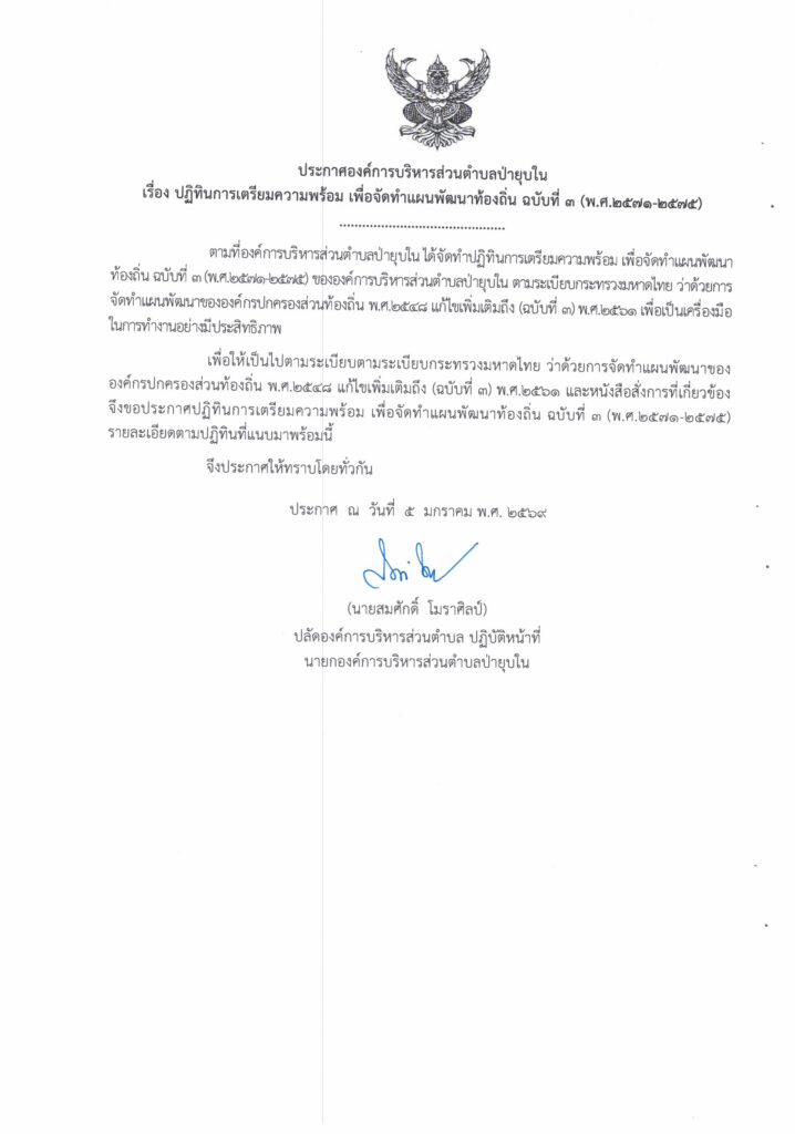 ประกาศ เรื่องปฎิทินการเตรียมความพร้อมเพื่อจัดทำแผนพัฒนาท้องถิ่น ฉบับที่ ๓ (พ.ศ. ๒๕๗๑ – ๒๕๗๕)