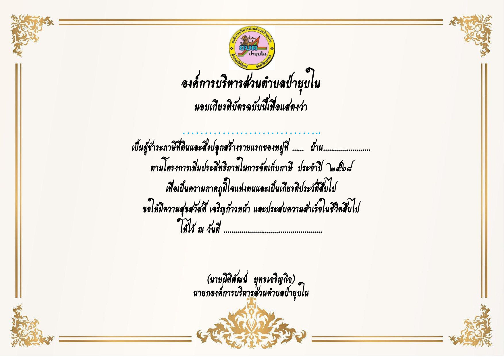 จะมีการมอบเกียรติบัตรสำหรับผู้ชำระภาษีที่ดินและสิ่งปลูกสร้างรายแรกของแต่ละหมู่บ้าน ในพื้นที่ตำบลป่ายุบใน ประจำปี พ.ศ 2568