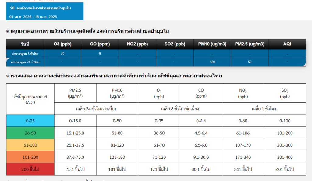 เช็คค่าคุณภาพอากาศรายวัน บริเวณองค์การบริหารส่วนตำบลป่ายุบใน ระหว่างวันที่ 1-16 เมษายน 2569 admin 3 ชั่วโมง ago เช็คค่าคุณภาพอากาศรายวัน