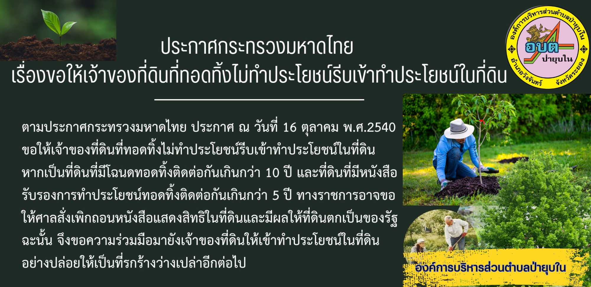 ประกาศกระทรวงมหาดไทย เรื่องขอให้เจ้าของที่ดินที่ทอดทิ้งไม่ทำประโยชน์รีบเข้าทำประโยชน์ในที่ดิน